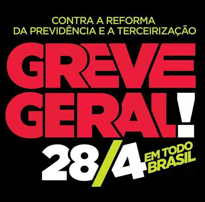 Amanhã dia 28/04 o Brasil deve parar!!! A Greve Geral organizada pela CUT em parceria com outras centrais sindicais vai mobilizar diversas categorias em todo o Brasil em defesa dos direitos sociais. A defesa da aposentadoria e dos direitos trabalhistas estarão em primeiro plano na disputa pela manutenção de um estado de bem estar social.