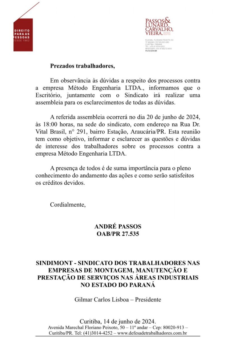 A referida assembleia ocorrerá no dia 20 de junho de 2024, às 18:00 horas, na sede do sindicato, com endereço na Rua Dr. Vital Brasil, n° 291, bairro Estação, Araucária/PR. Esta reunião tem como objetivo, informar e esclarecer as questões e dúvidas de interesse dos trabalhadores sobre os processos contra a empresa Método Engenharia LTDA.